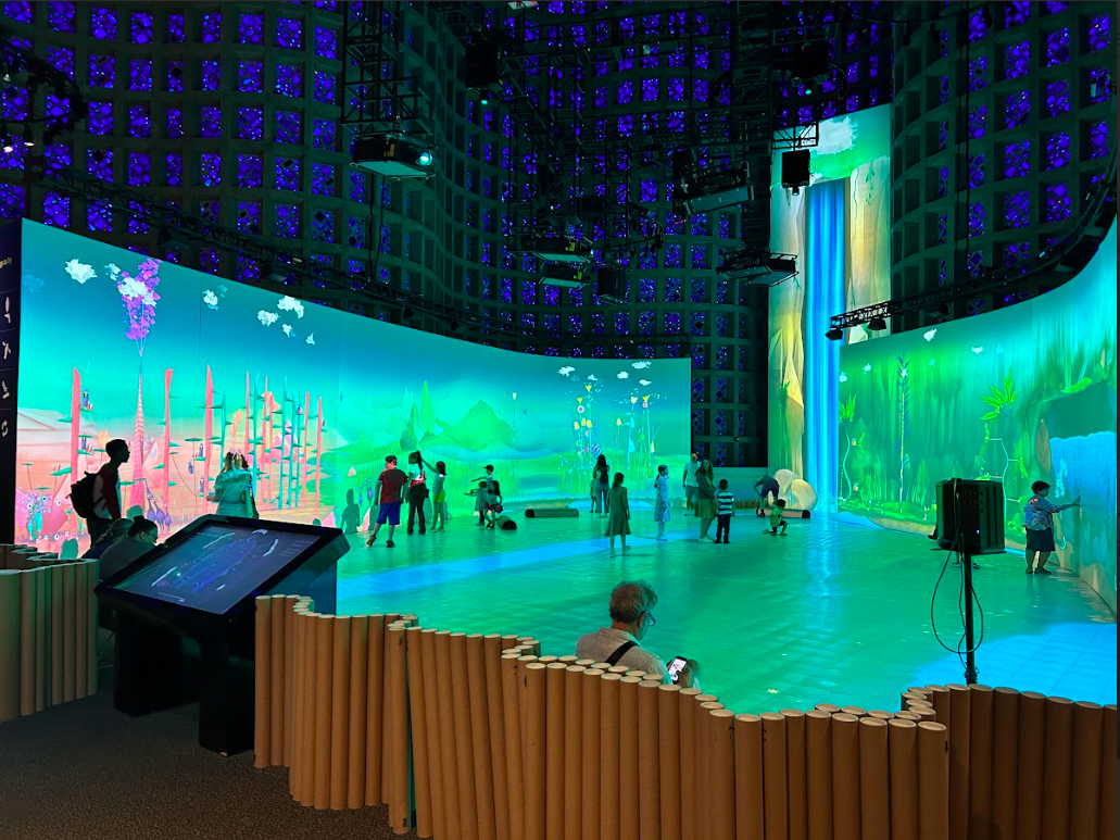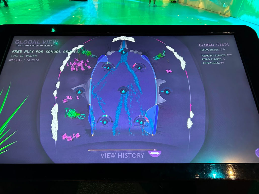 Tony continued that the large touchscreen touchtable needs replacement once a year due to wear and tear. He explained that the digital components of the exhibit such as the sensors, software, projectors, and cameras require maintenance every two months. He pointed out that one of the six ecosystems in the exhibit was not functioning as intended at the time of our visit.