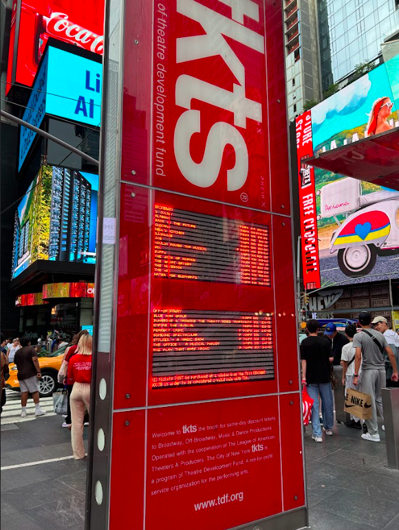 Prior to meeting with Purchase College students Jovanna Sampayo and Risa Tirado, I made my way around Times Square for a set of first impressions. As was present the last time I visited, I noticed the different types and sizes of media screens in the area. The screen at 20 Times Square was still impressive. Advertising their presence with their own kiosk Times Square Alliance founded in 1992, works to improve and promote Times Square, cultivating the creativity, energy and edge that have made the area an icon of entertainment, culture and urban life for over a century. I also passed by the extremely busy TKTS Live booth, complete with a running text display of the days performances.